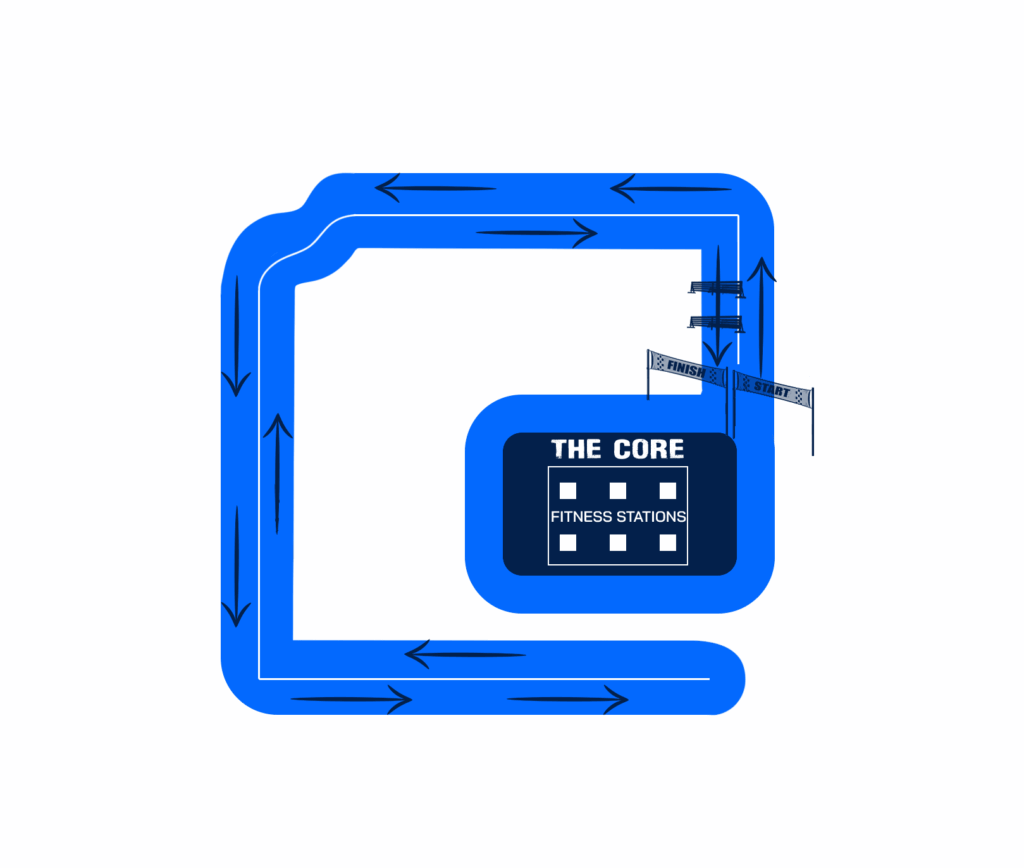 Nuclear Fit is 6 x 1km trail runs alternating with a unique functional fitness station in between each run . The fitness stations are all located in the buzzing central arena called The Core. The trail run will include 2 x 4ft hurdle obstacles. Waves start every 10 minutes and you have 2 hours to complete the race. Your chip timing tag will record your overall time and the split for each functional fitness station and each 1km run.