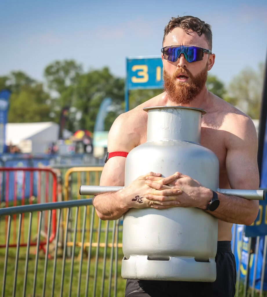 The competitor has to pick the urn up from the station, remembering to keep their core engaged. The carry begins when they cross the start line. The urn must be kept close to their chest and they can put it down at any time. The carry is complete once the competitor and the urn cross the finish line.